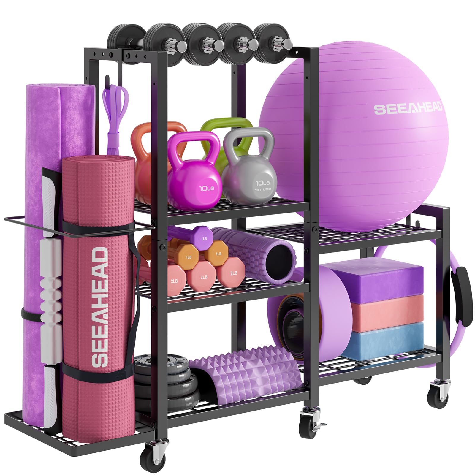 6-Tier Home Gym Storage Rack with Wheels, Dumbbell Weight Rack and Yoga Mat Organizer, Multi-Purpose Gym Equipment Storage Stand for Home Gym Accessories