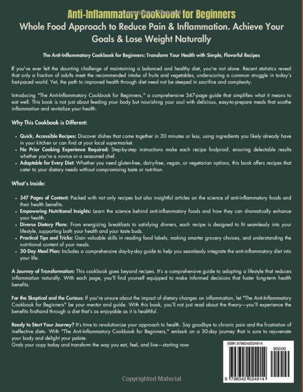 This book is designed with beginners in mind, removing the complexities and making it easy to start a lifestyle that reduces inflammation and pain. Whether you're new to the concept of anti-inflammatory eating or have tried it before and found it overwhelming, this guide simplifies everything. Step-by-step instructions, beautiful photographs, and helpful tips take the guesswork out of cooking and meal planning, making it fun and enjoyable to nourish your body.