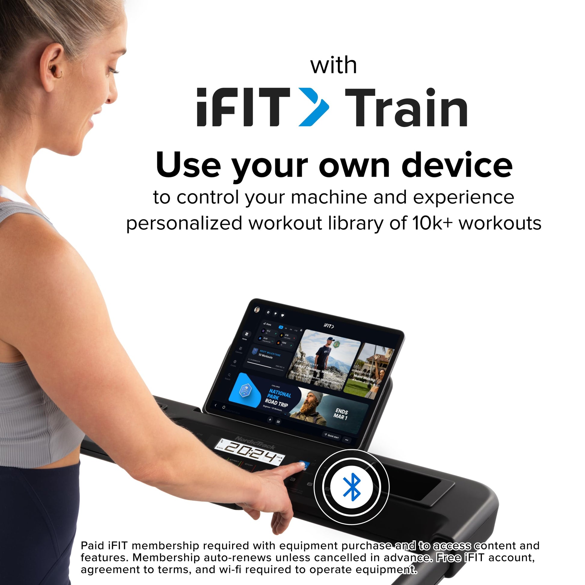 - [5" LCD Display & Device Shelf] - See your live workout stats on the clear 5” LCD display or use your own device to follow iFIT trainers and automatically control your treadmill, all from your phone or tablet. (Train Membership Required)